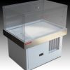 Refrigerated island with incorporated compressor unit, designed for display and promotion of packaged food products such as meats, vegetables, deli meats and dairy products.